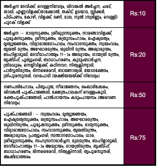 Please contact temple authority(+91 9446560765, +91 4792311263) for latest vazhpadu rates for online vazhipadu booking, send amount to the following account